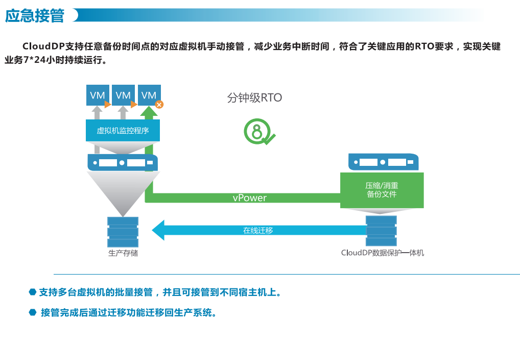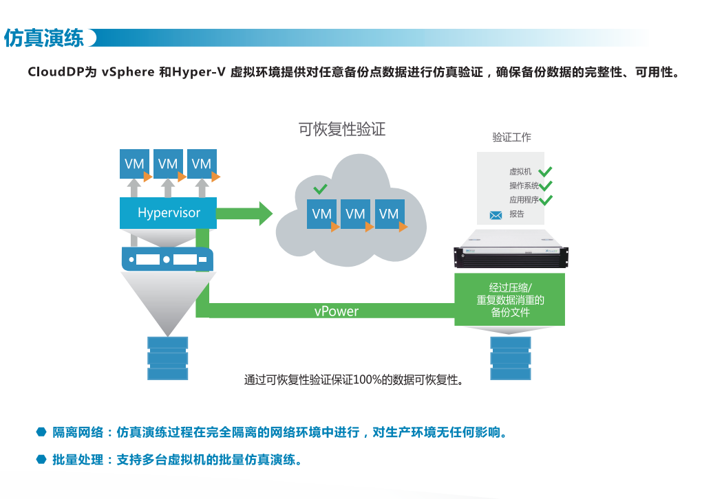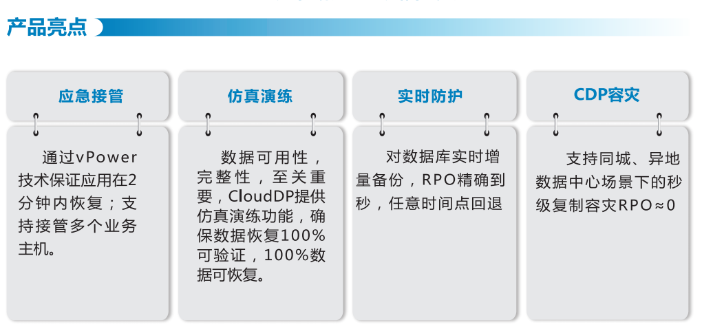 相孚CloudDP多云数据保护解决方案,支持VMware、Hyper-V、KVM等虚拟化环境和OpenStack、Zstack、H3C CAS、 Sangfor HCI(深信服)、FusionCom- puter(华为)等超融合平台环境下的无代理数据保护一体化交付方案。主要功能包括应急接管、数据库实时备份、恢复演练、重复数据删除、广域网加速、LAN-Freet备份,对多种应用(包括oracle、SQL、Exchange,SharePoint、AD等)进行无代理方式数据保护和容灾,实现应用感知和细颗粒度恢复。